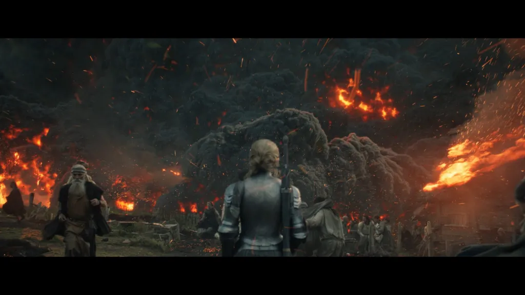 This was the Helm's Deep battle scene from The Two Towers, complete with cavalry charge to save the day. The fact that it wasn't a suicidal cavalry charge down a 45 degree angle is a mild step forward, but it was still utterly obvious and borderline meme-worthy. Fantasy of any kind requires a suspension of disbelief. Most of the time, watching material that contains orcs, elves, magic swords, and kingly prophecies (as well as people of color with agency, if you're a bigot) requires you to accept that you're in a world that treats those things as normal. But there still has to be some degree of belief in the basic physical properties of the world. I was hard-pressed to stay with this very average screenplay when being forced to believe that not only did the forces of Numenór arrive from across the ocean at just the right moment, but they would be heading for that specific spot in the enormous area around the gigantic Orodruín in full armor and at a full charge. This is putting aside that they were earlier traveling at that same full gallop in full daylight while it was still dark where the rest of our characters were fighting Adar and his orcs. This was just short of Gendry running forty leagues in a couple hours and still somehow a) getting to where he needed to be and b) surviving. Dramatic timing is what it is because it's at least partially believable and somewhat surprising. This was neither of those things.